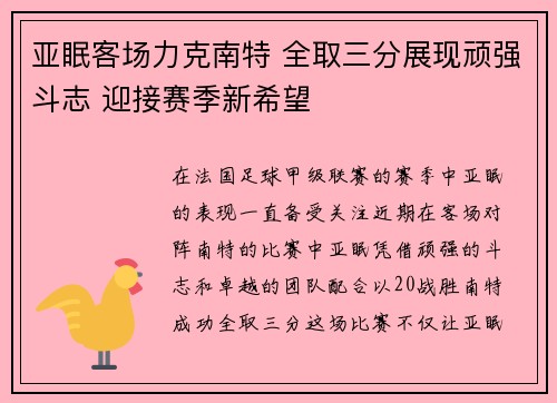 在法国足球甲级联赛的赛季中,亚眠的表现一直备受关注。近期,在客场对阵南特的比赛中,亚眠凭借顽强的斗志和卓越的团队配合,以2-0战胜南特,成功全取三分。这场比赛不仅让亚眠迎来了赛季的希望,也让球迷看到了...