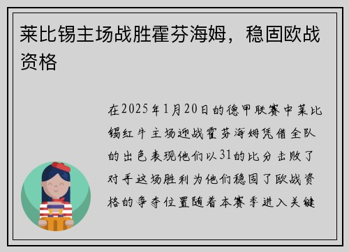 莱比锡主场战胜霍芬海姆,稳固欧战资格