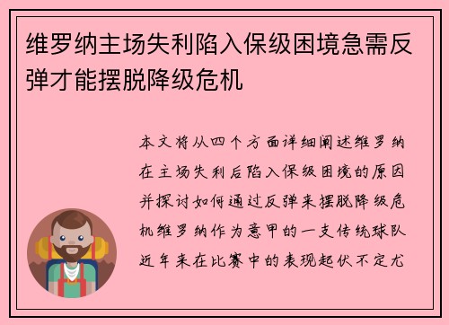 本文将从四个方面详细阐述维罗纳在主场失利后陷入保级困境的原因,并探讨如何通过反弹来摆脱降级危机。维罗纳,作为意甲的一支传统球队,近年来在比赛中的表现起伏不定,尤其是在主场的失利,使得他们在联赛中的保级...
